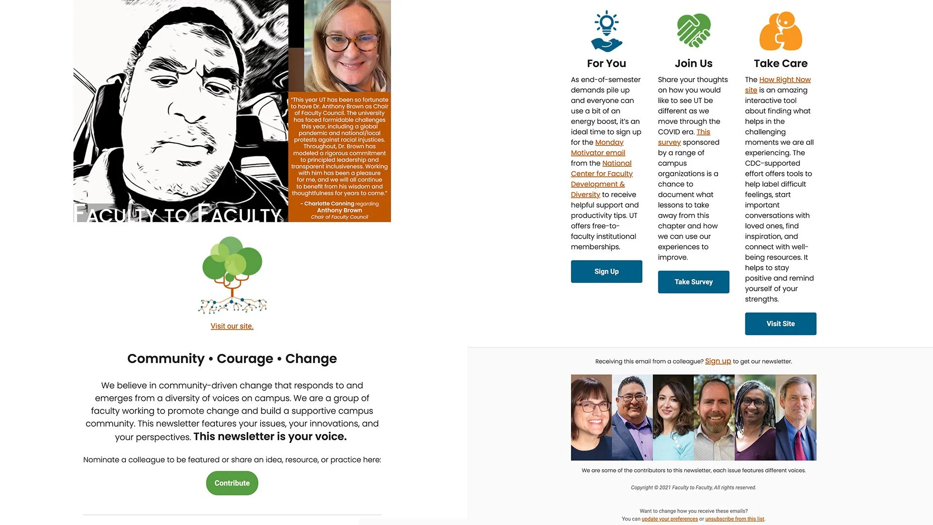 In the early stages of the COVID-19 pandemic, academic faculty everywhere were scrambling to understand how best to support their students and each other. A group of professors at the University of Texas approached us and asked for assistance developing a support system by faculty/for faculty during this chaotic and confusing time.